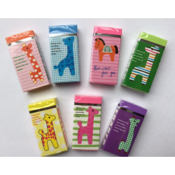 Leuke giraf gum, alle gummen zitten verpakt een leuke giraf verpakking. Veel verschillende uitvoeringen en kleurtjes. Prijs is per stuk, de gummen worden assorti geleverd. Afmeting: 5.75 x 2.75 x 1 cm