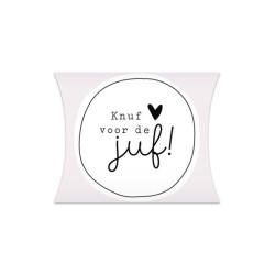 Sticker - Knuf voor de juf Kleuren: zwart, goud en wit Maak je traktatie of kadootje voor de juf nog leuker met deze hippe stickers! Je ontvangt 5 stuks Afmeting: rond 40 mm