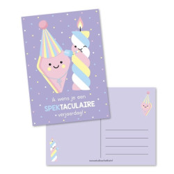 Ik wens je een spektaculaire verjaardag! Op deze schattige kaart staan twee spekjes afgebeeld. Een ruitspek en een kabelspek welteverstaan met een feestmuts op en een feesttoeter in de mond. Ze maken er een spektaculair feestje van! Ken jij iemand die bijna jarig en helemaal weg van spekjes is? Stuur dan dit kaartje naar diegene op! Stop je er ook een echt snoepspekje bij? Afmeting: A6 Merk: Studio Schatkist