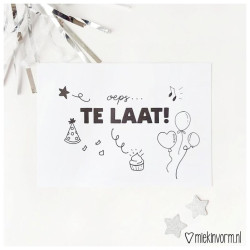 Een toffe kaart met de tekst 'oeps... te laat!' Oh neee ben je een verjaardag vergeten? Stuur deze leuk kaart dan naar diegene toe. Op de achterkant is er ruimte voor een persoonlijke boodschap op. En de kaart is natuurlijk ook heel leuk om alsnog bij een kadootje te voegen. Of stop hem in een transparant zakje, met een beetje confetti en stop er geld of een kadobon bij. De kaart is A6-formaat en is geprint op stevig kaartpapier met een ruwe matte uitstraling. Op de achterzijde is ruimte voor een adres en een persoonlijke boodschap. Merk: Miek in Vorm