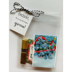 Wil jij je lieve juf of leuke meester bedanken ? Dan is dit heel leuk om uit te delen bij afscheid op een kinderdagverblijf of peuterspeelzaal Of geef dit leuke pakketje als kadootje aan het einde van het schooljaar Dit zit er in: * 3 geur waxinelichtjes * Feestelijk verpakt in een transparant...