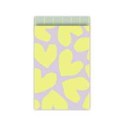 Kadozakje met een XL hartjes motief in de kleuren geel en lila Leuk detail, de binnenkant van het zakje is geruit in mint met geel Dit geeft een heel leuk effect als je het zakje terug dichtvouwt en sluit met een leuke bijpassende sticker. Je ontvangt 5 zakjes Afmeting: 12 x 19 cm