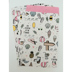 Leuke kadozakjes met een gezellig printje vol met zomerse items. Leuk detail, de binnenkant van het zakje is roze Prijs is per 5 stuks Afmeting 12 x 19 cm