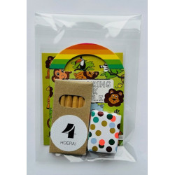 Super handige kant en klare verjaardagstraktatie. Leuk om uit te delen op een kinderdagverblijf of in de klas. Ook beschikbaar voor een afscheidstraktatie! Inhoud: – een jungle kleurboekje – een doosje potloodjes – eventueel iets lekkers naar keuze verpakt in een vrolijk kadopapiertje – zakje en feestelijk ingepakt met een traktatie-sticker naar keuze – Inhoud 1 stuk De traktaties worden kant en klaar aan geleverd en na ontvangst klaar om uit te delen. Levertijd is ongeveer 2 a 3 werkdagen. Je hebt de keuze om de traktatie in plastic cellofaanzakjes te laten verpakken of pergamijnzakjes. Pergamijn ziet eruit als semi transparant papier, maar is gemaakt van 100% cellulose. Ze worden milieuvriendelijk geproduceerd en zijn volledig recyclebaar en zelfs composteerbaar. Leu