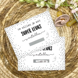 Zoeken jullie een originele manier om te vertellen dat jullie een kindje verwachten? Leuk is dan deze kraskaart. Onder het kraslaagje staat de tekst die dus pas zichtbaar wordt als het weggekrast wordt met vingernagel of muntje. Tekst: "Je wordt oma!" Formaat: A6 Materiaal: 340 grams stevig...