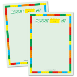Een legotastisch notitie-blok-je! Wie wil hier nou niet op schrijven of tekenen? Erg leuk voor juffen en voor meesters hebben we een stoere variant ! Altijd feestelijk verpakt ! Afmeting: A6 50 velletjes per blok Ontwerp: Studio Schatkist