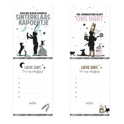 Met deze te gekke Sinterklaas wenskaarten kan ieder kind zijn of haar wensenlijstje invullen. Perfect voor in de schoen van ieder kind. A6 ansichtkaarten van 350 grams papier. Full color bedrukt, plus zilverkleurige inkt.