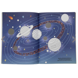 Als je dit boek opent, komen er allerlei planeten, sterren en aliens tevoorschijn. Ontdek welk ruimteschip de aarde zal bereiken, geef de aliens monden en slijmerige ogen en plak de maan op zijn plaats… Dit boek zit boordevol glow in the dark stickers en leuke spelletjes. Afmeting: 27 x 20 cm Geschikt vanaf 3 jaar