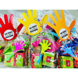 Kant en klare 'Aju Paraplu' traktatie ! Leuk om uit te delen op een kinderdagverblijf of peuterspeelzaal Standaard inhoud: – een klapperhandje – een roltong – een ballon – eventueel iets lekkers naar keuze verpakt in een vrolijk kadopapiertje – zakje met confetti en bijvoorbeeld de sticker 'Aju...